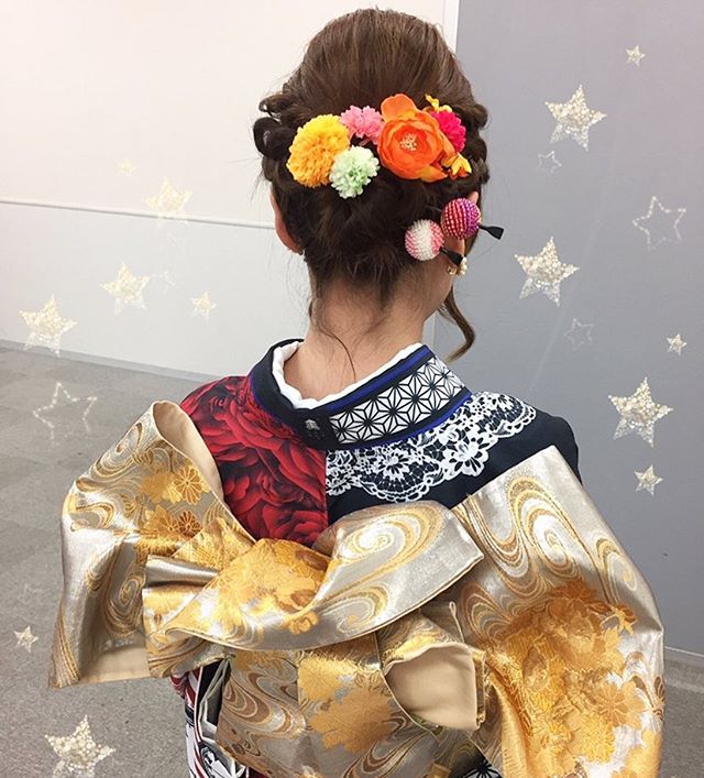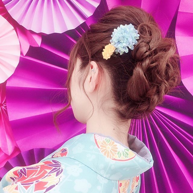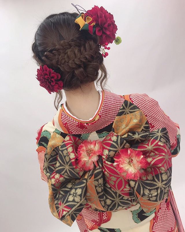 こちらは成人式にピッタリなヘアセットです。三つ編みハーフアップを二重につくっている上にギブソンタックを合わせて3重にまとめられた非常に手間暇かけられた素敵な髪型です。花飾りもアシンメトリーに添えられており、火所に華やかです。