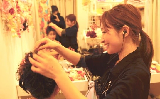 こちらは花飾りオプションプレミアムです。髪全体にカールをかけつつ、大きなリボンや花飾りをたくさん使用して可愛らしい仕上がりにしています。大きなリボンがあるため可愛らしいという印象が大きくなりますが、逆にリボンがないときはカールとハーフアップになっているので大人びて見えるという、どちらにも合うヘアセットです。