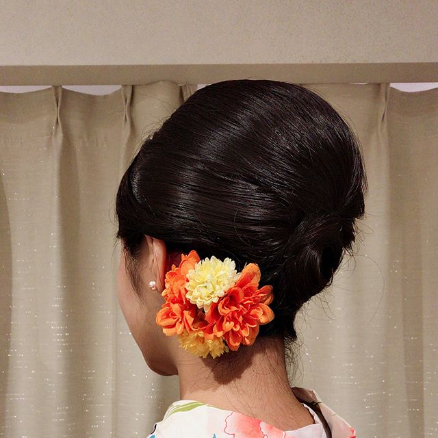 こちらは着物レンタルVASARA銀座3丁目店でよく利用されている夜会巻きです。きちっとして見えるうえに芯のある大人な女性感を出すことができます。夜会巻きだけでなく大きな花飾りを耳元に挿すことでカジュアルなこなれ感も演出しています。