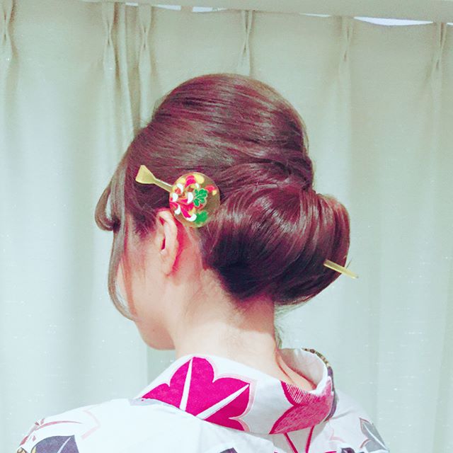 こちらはヘアセットスタンダードのお団子ヘアです。かんざしと着物の色を合わせてまとまり感を出しています。お団子のまとめ方は髪を三つ編みにして、後頭部を中心にぐるっと何周かさせて、ピンでとめたところにかんざしを挿すというやり方です。簡単ながら涼しげで春の暖かくなる時期や夏にもぴったりのヘアセットです。
