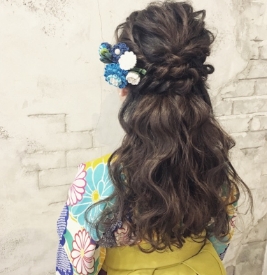 こちらも成人式にあったヘアセットです。ハーフアップは同じなのですが、ハーフアップ部分に花飾りをたくさん挿して花冠のように見える素敵な髪型です。華やかな場には花飾りで演出するのがオススメです。