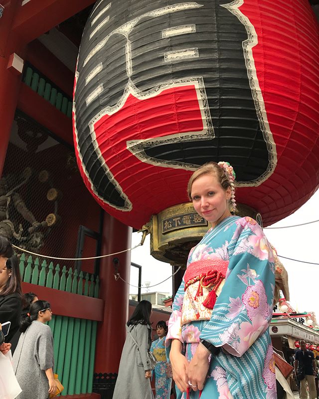 伝法院通りから雷門へ向かいます。11:30は人の多い時間帯なので、できる限り人が入り込まないように撮影するにはコツがいります。コツは雷門の赤い提灯のすぐ手前に立って撮影すること。カメラを下から見上げるようなアングルにすると赤い提灯がより大きく感じられ、腰から上で撮ってもらうと他の人がほぼ映り込まなくなります。