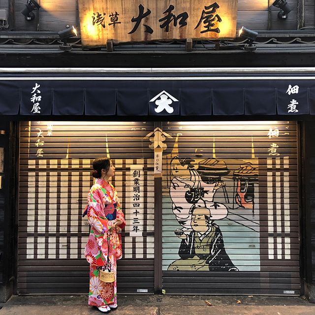 伝法院通りは下町情緒と歴史を感じる建物が軒を連ねます。建物の前に着物姿でいると、まるで江戸時代の町屋にタイムスリップしたような写真が撮れます。また、お店のシャッターには思わず写真を撮りたくなるような浮世絵風のイラストが描かれているので、伝法院通りにあるお店が開店していない時間でも楽しめます。