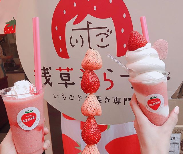 仲見世通りに戻ってきたら、甘いスイーツにときめきませんか。いちごスイーツ専門店の「浅草そらつき」では、甘酸っぱい大粒いちごがキメ細かいミルキーソフトクリームの上に乗っている「いちごスムージー」と赤と白のいちごが贅沢に楽しめる「いちご串」などいちごスイーツが満載。食べるのがもったいないくらいカワイイと人気です。いちごスイーツは一日のご褒美にピッタリです。